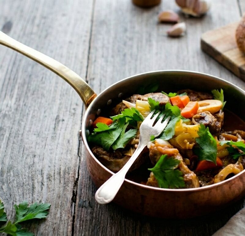 5. 4. Riv färsk bladpersilja över osso buccon strax före servering.