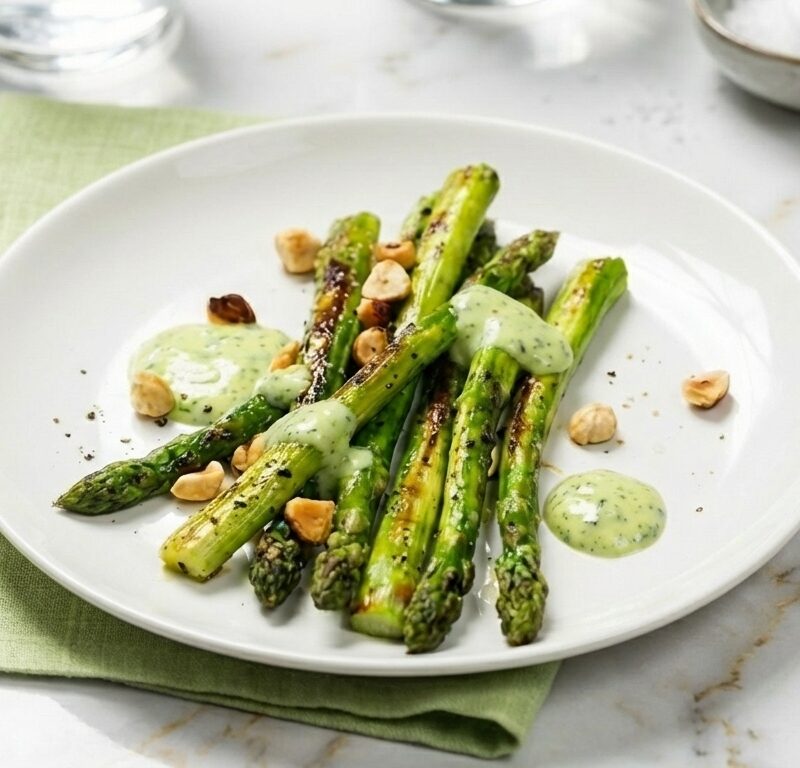 Rostad grön sparris med hasselnötter och ramslöksaioli