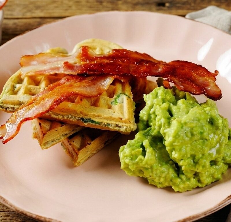 Matiga våfflor med spenat i våffelsmeten, därtill krämig avocadodipp och knaprigt bacon.