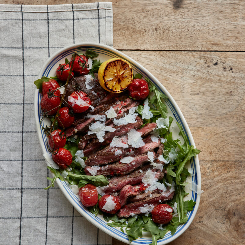 4. Ta fram ditt finaste fat. På med ruccola. Lägg över köttet, på med tomater, skeda över smöret och hyvla över parmesan!